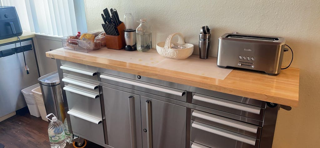 The workbench is very well made. It is solid and well designed. The welds are clean, and the drawers are sturdy and hold a great deal of weight. Additionally, the drawers slide easily and have full extension creating complete visibility for easier access and viewing. One of the reasons we selected this workbench was for its length of work surface, number of drawers and the adjustable shelving. As an added bonus, the workbench comes with pre-cut shelf and drawer liners. Finally, the wheels are commercial-grade and have a fantastic locking mechanism that is easy to use and holds very well. Since the double-doors don't have a center stile the full width of the shelves, nearly 3 feet, is completely accessible and adjustable. The bottom line, this is an excellent workbench not only for my rolling kitchen, but also for any workshop. The Trinity customer service was amazing and they really stand behind their product. I am now a lifetime Trinity customer.