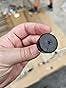 A close-up image shows the bottom of a thick black cylindrical metal furniture leg resting on a circular black plastic furniture glide or foot. A silver, threaded metal bolt connects the leg and the glide, which is designed to protect the floor and level the item.