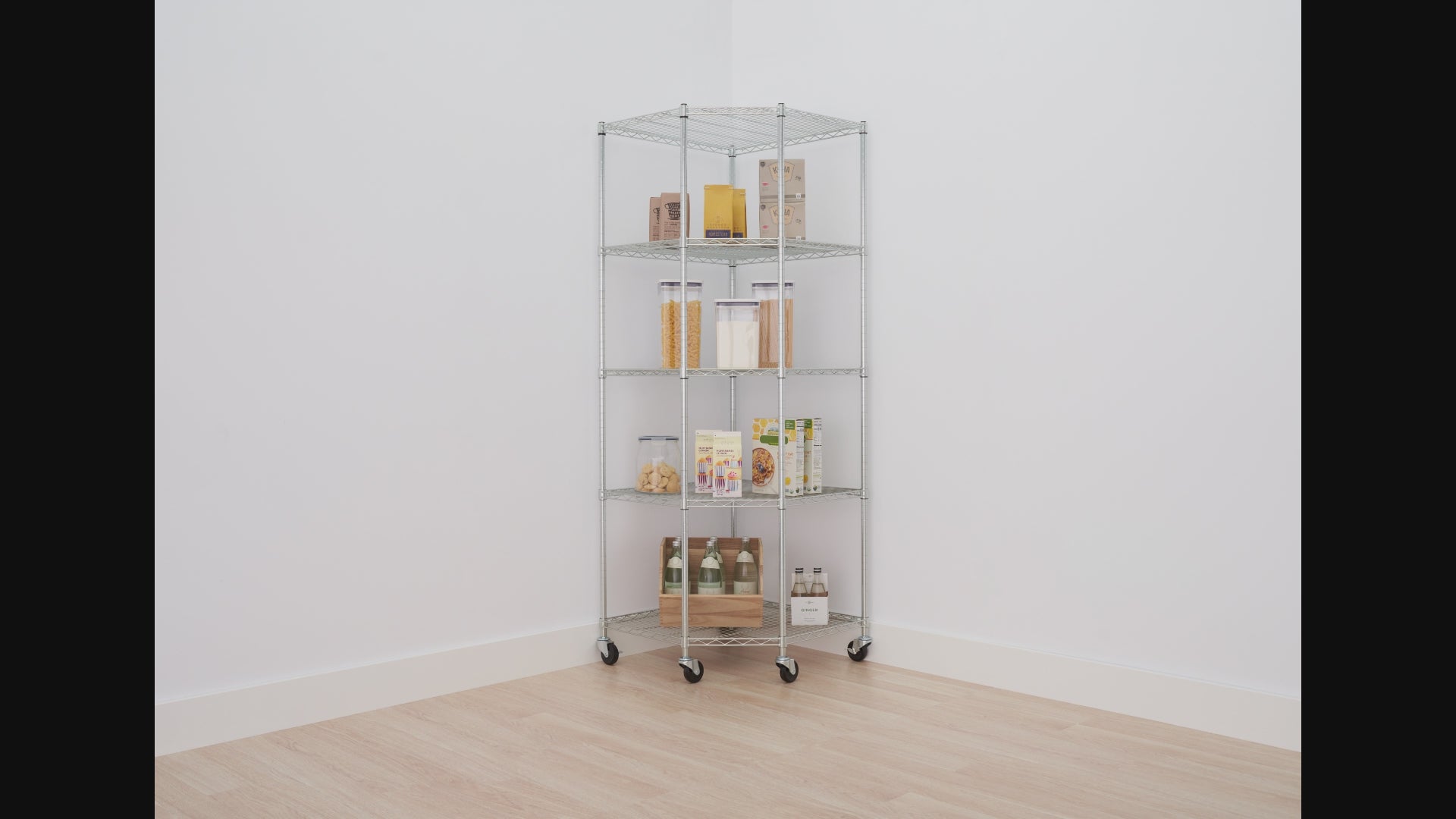 A tall, five-tier chrome wire corner shelving unit with wheels is positioned in the corner of a white-walled room with a light wood floor. The shelves are neatly stocked with various pantry items, including clear containers of pasta and flour, boxes of cereals and dry goods, and bottles of drinks on the bottom shelf.